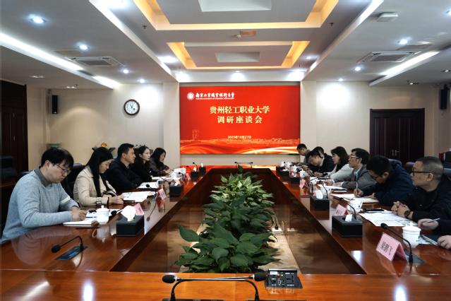10月27日上午,贵州轻工职业大学党委副书记、校长杨天仪一行来校调研,Beat365官网党委书记谢永华在行政楼辅楼一楼会议室接待来宾,相关职能部门负责人参加座谈。