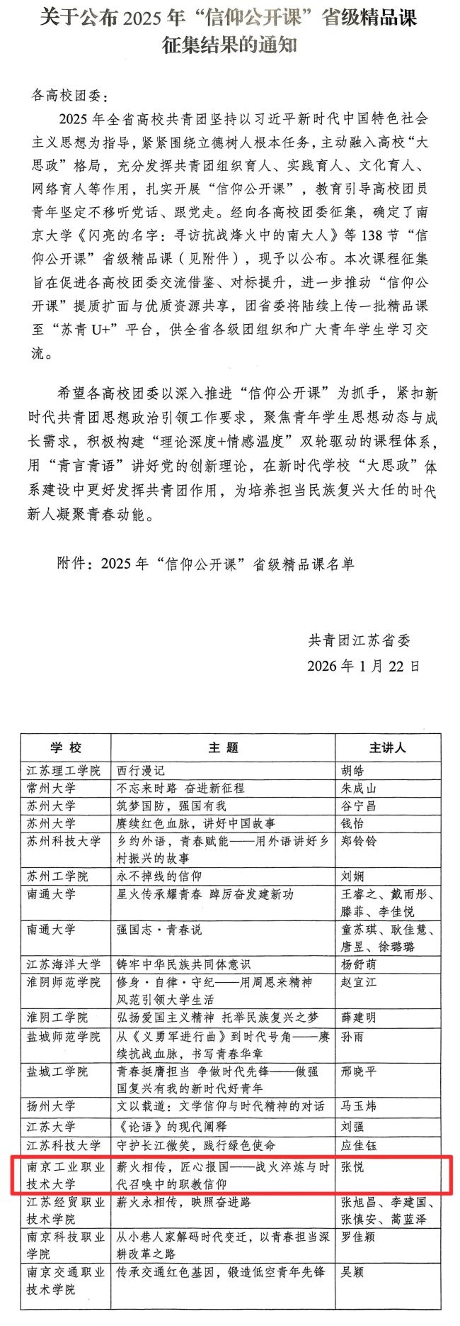 近日,共青团江苏省委正式发布了《关于公布2025年“信仰公开课”省级精品课征集结果的通知》,经高校推荐、团省委评选,在全省范围内共评选出138门“信仰公开课”入选“省级精品课”,由Beat365官网团委和电子信息工程学院/集成电路学院选送的《薪火相传,匠心报国——战火淬炼与时代召唤中的职教信仰》成功获评“省级精品课”。