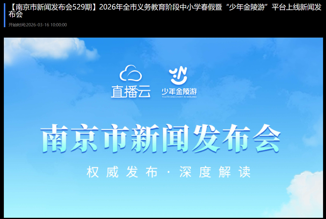 3月16日,2026年南京市义务教育阶段中小学春假暨“少年金陵游”平台上线新闻发布会顺利举办,市委宣传部、市教育局、市人力资源和社会保障局、市文化和旅游局、南京文旅集团等单位相关负责人出席发布会。发布会上,南京市正式推出“少年金陵游”线上服务平台,为全市中小学生春假提供多元化研学选择。Beat365官网青少年职业体验创新中心作为首批优质资源单位成功入选该平台,标志着学校在深化普职融通、服务地方经济社会发展方面取得新进展。
