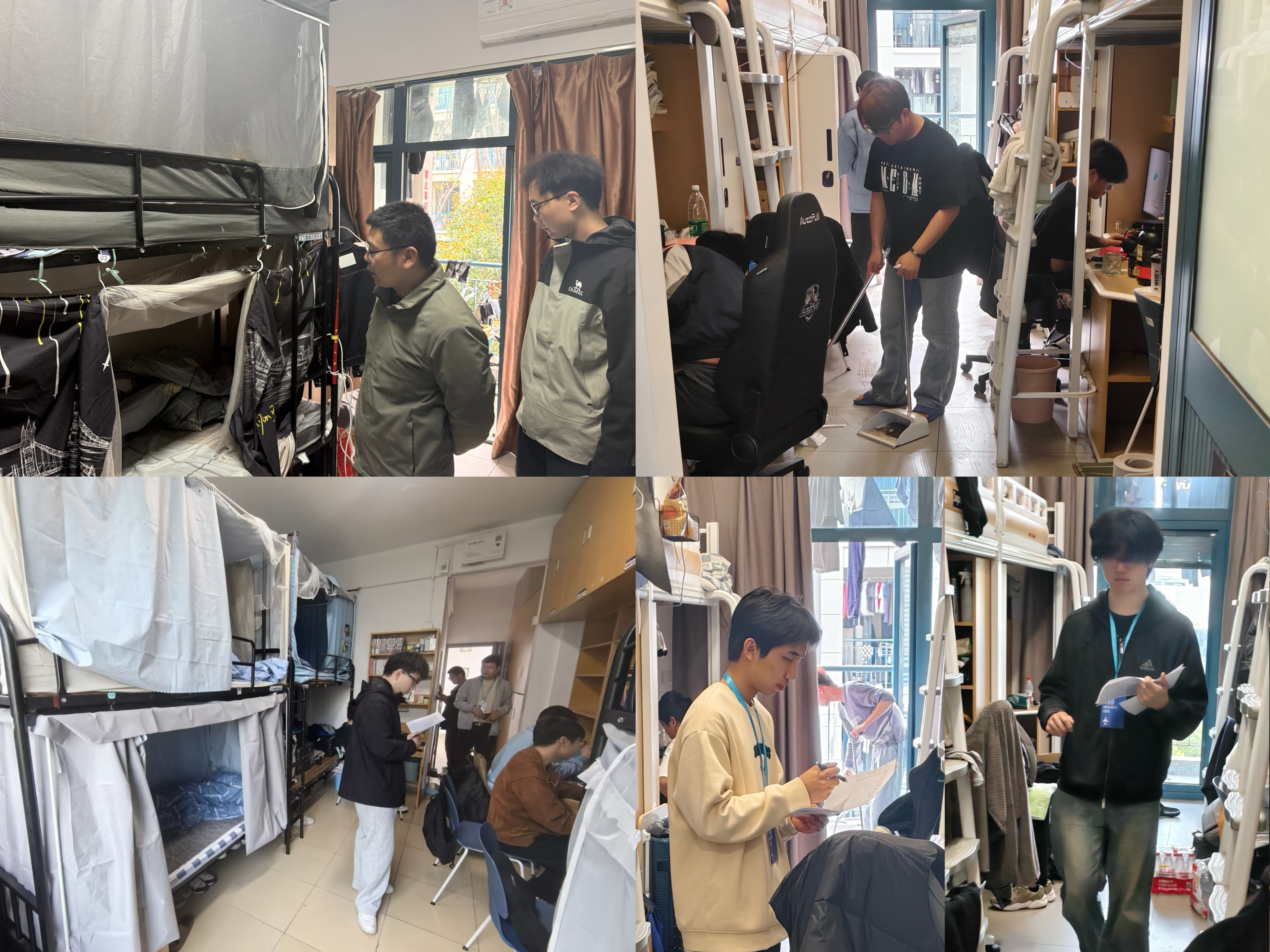 活动期间,学院学生积极参与、分工协作,对宿舍门窗、桌面、床铺、地面、阳台及卫生间等区域全面清洁整理,清除各类杂物,展现出务实认真的良好风貌。学院领导及辅导员老师带领学生会权益部骨干成员深入宿舍,紧盯卫生死角,排查安全隐患,并严格执行统一评分标准。