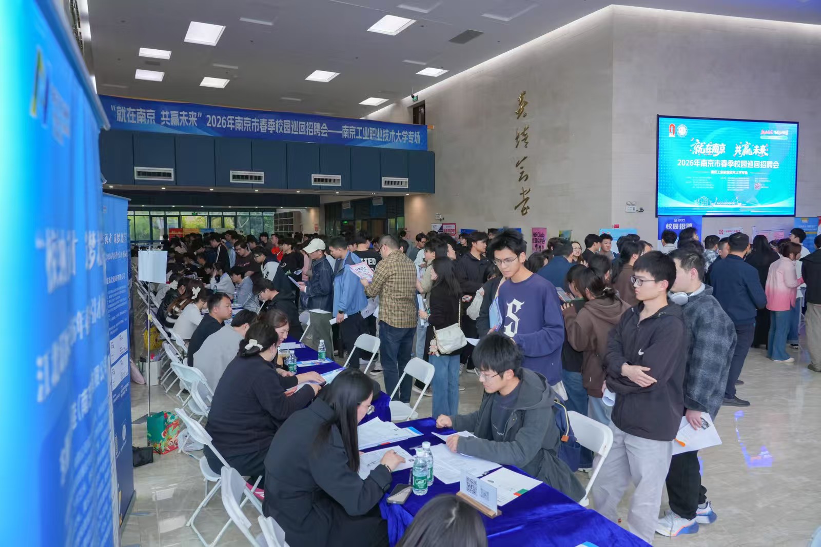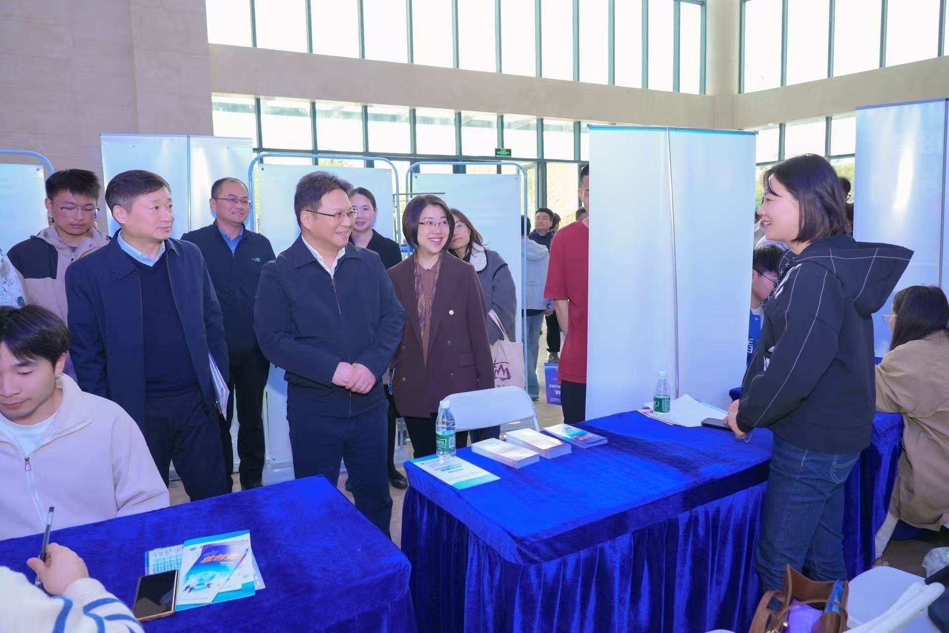 宣讲会后,何学军、高宏彦同与会领导深入招聘现场,与用人单位代表深入交流,详细了解各区重点产业及企业人才需求情况,关心现场学子求职进展。50家优质用人单位提供700余个就业岗位,涵盖智能制造、信息技术、新能源、现代服务等多个领域,活动现场还设立了就业指导专区,为毕业生提供就创业政策、紫金山英才卡(青柠码)、住房租赁补贴等一站式咨询服务。毕业生积极投递简历,与招聘人员深入交流,现场气氛热烈。