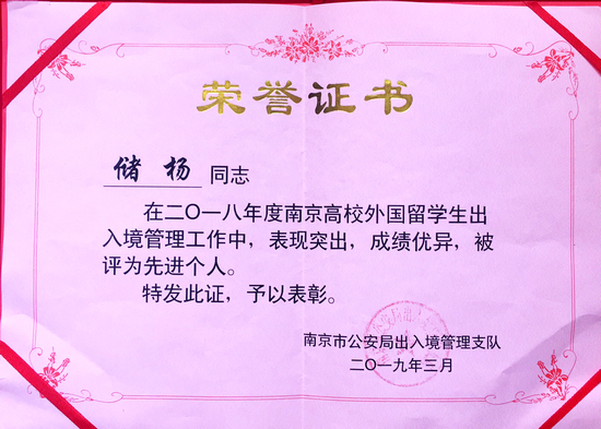 Beat365官网国际教育学院储杨老师荣获2018年度南京高校外国留学生出入境管理工作先进个人称号,这也是Beat365官网首次获得此类奖项。