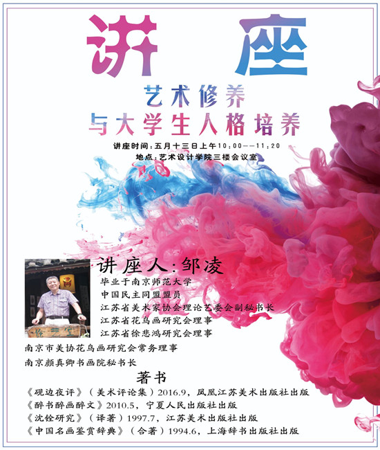 为了进一步提高学生良好的职业素养与高尚的人格培养,拓宽学生的知识面,提升对中国传统文化艺术品的鉴赏能力,艺术设计学院于5月13日上午10:00在敬业楼阶梯教室组织开展了《艺术修养与大学生人格培养》专题讲座。讲座由《江苏工人日报时代周刊》副主编、江苏省美术家协会理论委员会副秘书长邹凌主讲,讲座现场座无虚席、气氛热烈,讲座通过徐悲鸿的故事,讲述了一代大师的人格修养,引用中外艺术名家名言阐述艺术人格及道德规范、道德修养的培育,最后介绍了如何提升学生艺术心智的途径和方法。