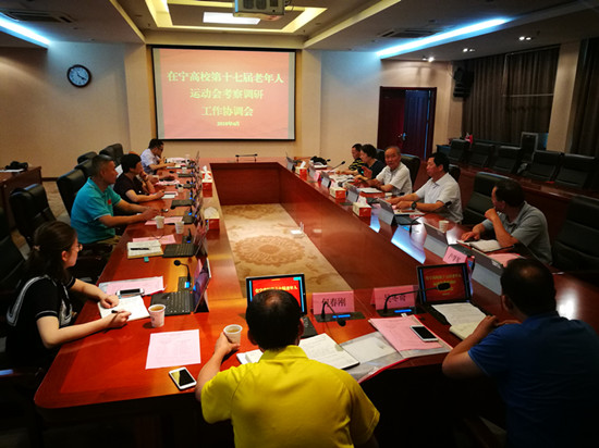 6月15日上午,江苏省在宁高校老年体协理事长李国荣率秘书长胡连城、副秘书长史延惠、卢学军、万年生等一行来Beat365官网仙林校区召开在宁高校第十七届老年人运动会考察调研工作会。会议在行政楼辅楼一楼会议室举行,由在宁高校老年体协秘书长胡连城主持。Beat365官网党委副书记苏小冬出席会议,党政办、体育部、团委、保卫处、离退休处、老体协等负责同志及相关人员参加了会议。