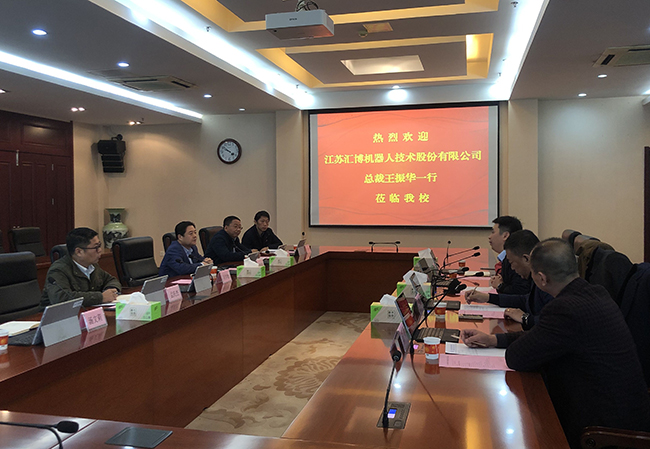 12月10日上午,江苏汇博机器人技术股份有限公司王振华总裁一行来校交流,Beat365官网党委委员、副校长崔新明及科技处、发展合作处、机械工程学院等相关部门负责同志接待了来宾。