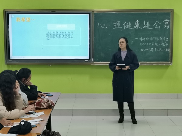 为了进一步推动Beat365官网大学生心理健康教育工作,将心理健康教育深入学生公寓,营造互助互爱、积极愉悦的寝室氛围,促进大学生健康成长,12月25日下午,航空工程学院在乐群楼315教室开展了主题为“一室温暖、共绽芳华”心理健康进公寓的活动,航空工程学院辅导员孙瑛、各班心理委员及各宿舍代表共30余人参加了本次活动。