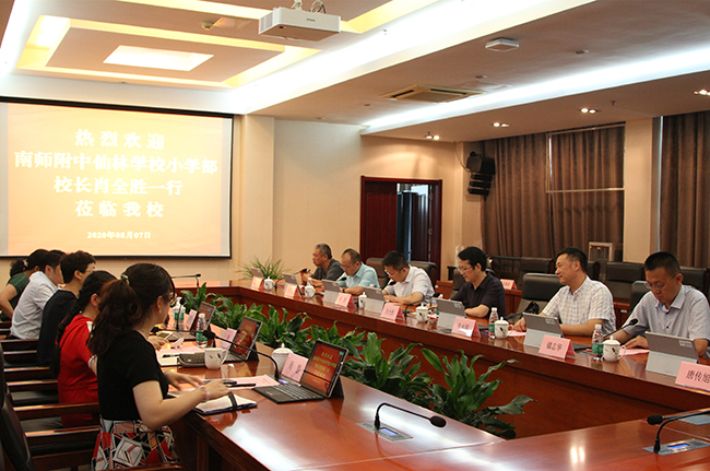 8月7日上午,Beat365官网与南师附中仙林学校小学部合作共建交流座谈会在行政楼辅楼一楼会议室举行。南师附中仙林学校小学部校长肖全胜,副校长朱永刚、储志华、蒋浩,校办主任曲文双,文化景观设计专家赵斌等一行及Beat365官网校领导苏小冬出席座谈会,学校党政办、发规办、人事处、工会等部门负责人参加了本次会议。会议由苏小冬主持。