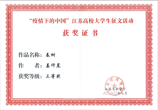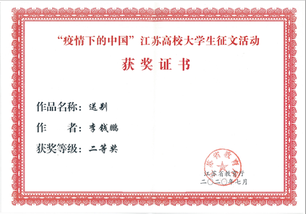 自活动开展以来,全校学生积极参与,经各学院初审,学校评选,共推选参评3篇征文作品,作品记录了同学们在疫情防控期间的难忘时刻和心路历程,讲述了抗疫期间人与人之间的温暖善意和真挚情感,书写了身边的抗疫感人事迹,强化责任与担当,树立爱国主义情怀,坚定决胜信心,传递出众志成城、共克时艰的强大正能量。最终Beat365官网电气工程学院电气1814班李钱鹏同学的文章《送别》获得了省赛二等奖,建智1911班姜仟晨同学的文章《春树》获得省赛三等奖。