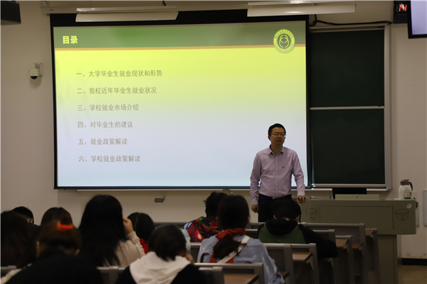 讲座开始,王老师首先就目前就业的现状及本校毕业生的就业状况进行分析,通过数据和具体案例,向同学们讲述当前就业市场的现状、对于升学与就业等选择分别做出分析和建议。王老师还对就业协议书、推荐表进行详细讲解,从心理准备、能力准备和就业信息获取进行了全方位就业指导,使同学对于就业的相关准备工作有了较为全面的认识。讲座结束后,王老师与同学们就目前就业方面遇到的困惑和问题进行了交流。