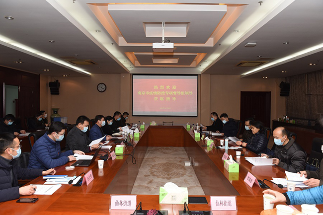 1月22日上午,南京市疫情防控督导组在市政协港澳台侨和外事委员会副主任毛卫华组长带领下,对Beat365官网新冠疫情防控工作进行专项督查,大学城管委会党工委委员、副主任孙金娣,以及管委会相关部门负责同志陪同督查。学校党委常委、副校长崔新明,疫情防控办相关部门负责同志参加现场督查和座谈。