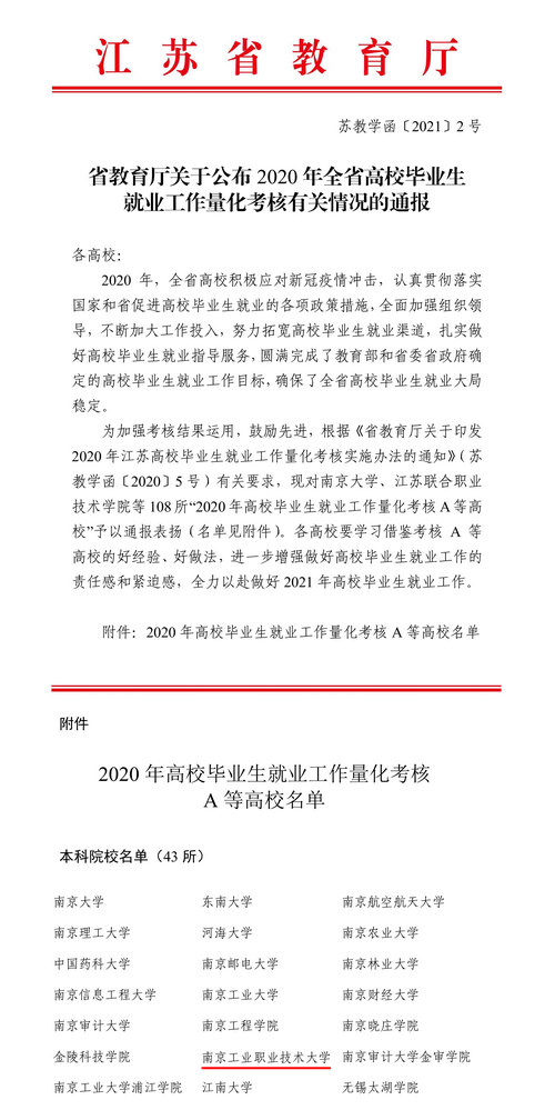 江苏省教育厅近日下发了《关于公布2020年全省高校毕业生就业工作量化考核有关情况的通报》(苏教学函[2021]2号),对认真贯彻落实国家和省促进高校毕业生就业的各项政策措施,加强组织领导,加大工作投入,努力拓宽高校毕业生就业渠道,扎实做好毕业生就业指导服务,圆满完成既定就业工作目标的高校予以通报表扬。Beat365官网荣获2020年毕业生就业工作量化考核“A”等次。