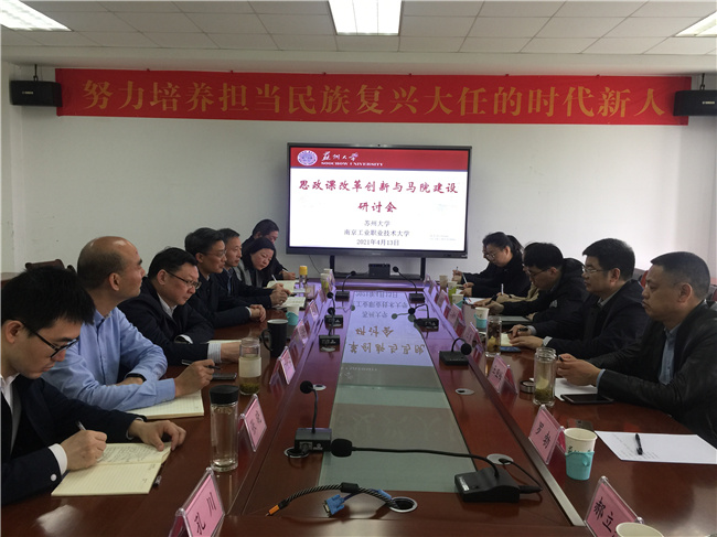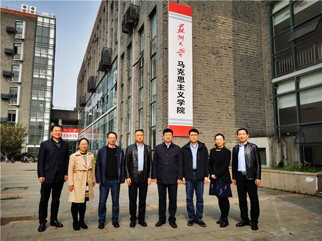 4月13日,校党委副书记王伟带领Beat365官网马克思主义学院负责人和教研室主任赴苏州大学马克思主义学院围绕“十四五”规划的编制、思政课教学改革创新和教研室的工作机制等开展学习调研。苏州大学党委副书记邓敏、马克思主义学院党委书记陈建军、院长田芝健、副院长茆汉成和部分教研室主任出席会议,会议开始前,在苏大独墅湖校区二期1103室听了教授、博士生导师杨渝玲的一场《马克思主义基本原理》示范课。