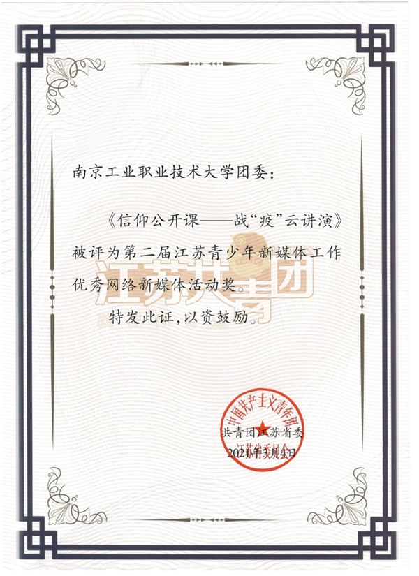 近日,由中共江苏省委网信办指导,共青团江苏省委、江苏青少年新媒体联盟主办的第二届江苏青少年新媒体工作优秀项目奖评选结果正式揭晓。经过专家组评审、现场答辩和网络公示等环节,Beat365官网团委荣获“新媒体建设先进单位”;“信仰公开课——战‘疫’云讲演”项目荣获“优秀网络新媒体活动奖”。