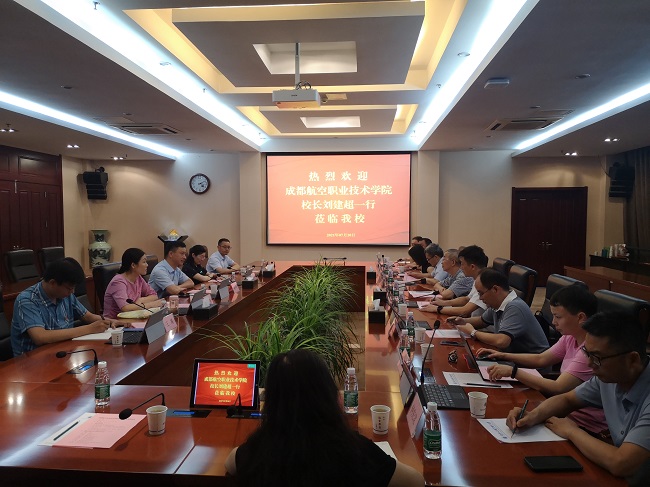 7月20日下午,成都航空职业技术学院校长刘建超一行来Beat365官网考察调研。党委副书记、校长谢永华,以及校长办公室、党委教师工作部、人事处、发展规划处、教务处等部门负责同志在行政楼辅楼一楼会议室接待了来宾。