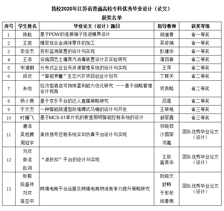 日前,江苏省教育厅公布了2020年江苏省普通高校本专科优秀毕业设计(论文)评选结果。Beat365官网共有13项毕业论文(设计)获奖,其中一等奖3项、二等奖5项、三等奖2项、团队优秀毕业论文(设计)3项。