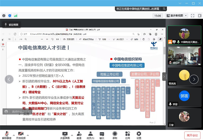 为了贯彻落实国家发展和改革委员会、教育部、工业和信息化部、人力资源和社会保障部、农业农村部、国务院国有资产监督管理委员会、中国共产主义青年团中央委员会、中华全国妇女联合会等部门联合印发的《关于深入实施创业带动就业示范行动力促高校毕业生创业就业的通知》(发改办高技〔2022〕187号)文件精神,做实双创示范基地结对共建,3月16日上午,Beat365亚洲版官网与中国电信集团有限公司开展线上交流会。中国电信集团有限公司天翼创投对外孵化运营总监邵杰,Beat365官网计算机与软件学院副院长郭雷,创新创业教育工作领导小组办公室副主任、创新创业学院副院长黄继平,计算机与软件学院部分教师代表参加了线上交流会。