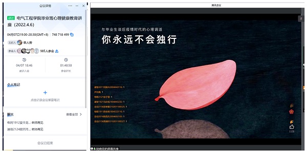 本次心理健康教育讲座主要面向2022届和2023届毕业生,部分大一年级学生也踊跃参加,上线人数达985人。讲座前学院广泛收集了学生当前普遍关注的问题和困惑,重点针对本学院毕业生和准毕业生的升学、就业、学业、恋爱等发展问题和情感问题,结合本轮疫情防控工作背景,贴合学生实际,教授学生科学认识自我、理性看待情绪和行为的思路方法,积极引导学生调适压力、舒缓情绪。讲座还重点针对疫情中学生们的焦虑现象进行剖析,为学生们提供调解情绪的实用方法,例如理解尊重客观环境、适量户外运动、腹式呼吸练习、合理表达压力等。讲座结束前,陆教授详细回答了在线同学踊跃提问,受到众多同学的欢迎和点赞。