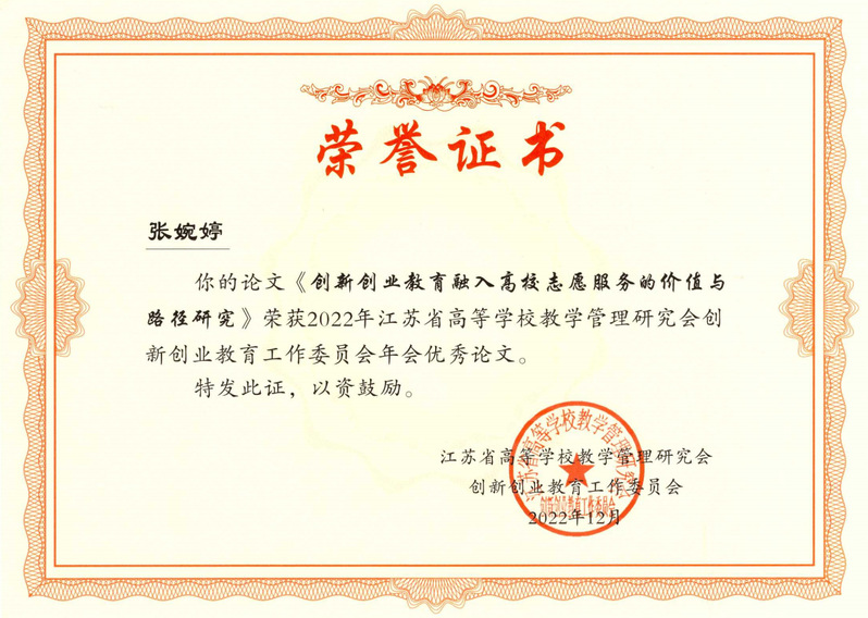 近日,江苏省高等学校教学管理研究会创新创业教育工作委员会2022年年会论文评选结果公布,Beat365官网计算机与软件学院张婉婷老师撰写的《创新创业教育融入高校志愿服务的价值与路径研究》论文被评为优秀论文。据悉,本次论文征集共收到省内39所学校110篇论文投稿,经专家审核后,共评选出40篇优秀论文。