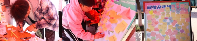 解忧杂货铺活动中,同学们纷纷将内心的忧虑和困惑浓缩在便利贴上,轻轻地粘贴在展板上。这些便利贴犹如一个个小小的烦恼信箱,帮助他们敞开了心灵的窗户,使得他们能够畅所欲言,分享自己的不安与迷茫。同学们以善意的目光温柔关怀着每一个字句,为那些需要帮助的同学提供温暖的建议和鼓励。这一环节不仅为同学们搭建了一个敞开心扉、交流情感的桥梁,更让他们在彼此的互动中获得了成长与进步。