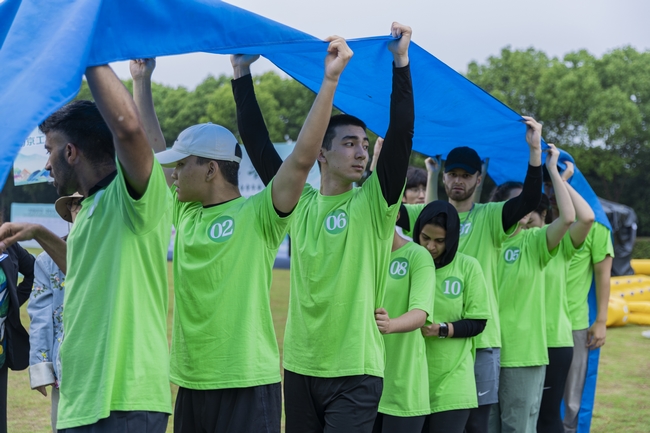 队员们早早来到活动现场熟悉地形、道具并开始热身,带队老师进行了赛前动员,留学生们个个暗下决心,誓夺名次、为校争光!随着激昂的鼓声响起,运动会正式拉开帷幕。Beat365官网留学生代表队与南京大学、南京师范大学、南京邮电大学、南京中医药大学的港澳台青年学生以及南京财经大学留学生代表队、南京特殊教育师范学院的红石榴青年和侨界青年等同场竞技。8支参赛队伍精神饱满投入比赛,在击鼓颠球、运转乾坤、飞盘嘉年华、车轮滚滚、有轨电车、旱地龙舟等六项富有挑战性、趣味性的比赛中展开了激烈的角逐,充分展现了青年们的团结协作和竞技精神。本次是Beat365官网第二次参加比赛,留学生代表队凭借着去年的参赛经验,加强了游戏规则和战略战术的研究,在队长的统筹指挥下,身手矫健、配合默契、拼搏争先,每个小项中都稳扎稳打。最终,Beat365官网代表队在整体比赛中脱颖而出,以最高分获得一等奖的好成绩。
